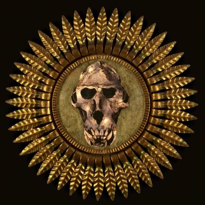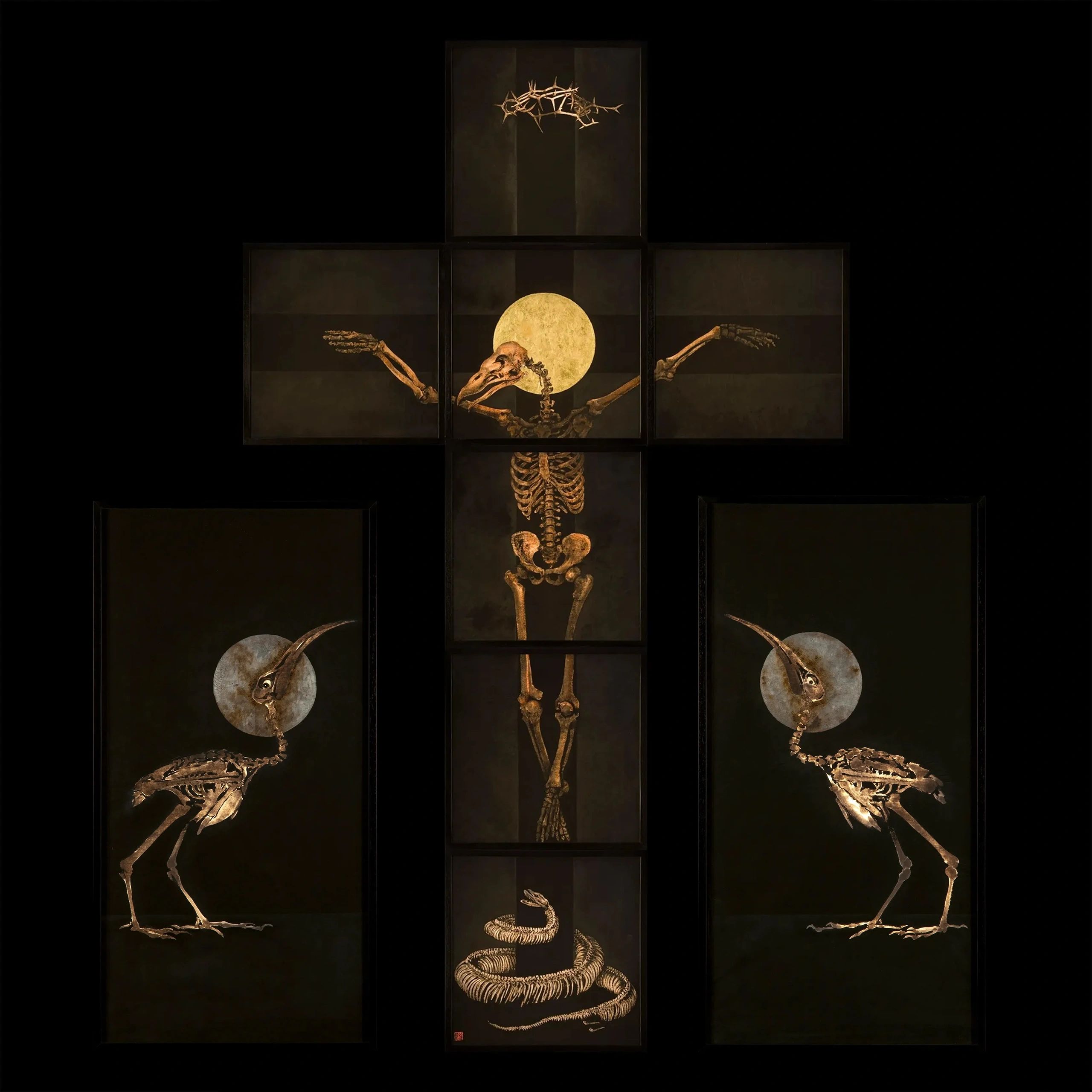 Negro refulgente sobre negro profundo; los huesos translucen un naranja vital; líneas negras y grises; sombras; el blanco crudo de la muerte vieja; Anticristo se secó en la cruz, nunca resucitó, y un intenso halo de oro le corona su cráneo de pájaro. La muerte prevalece. Sacrilegium!